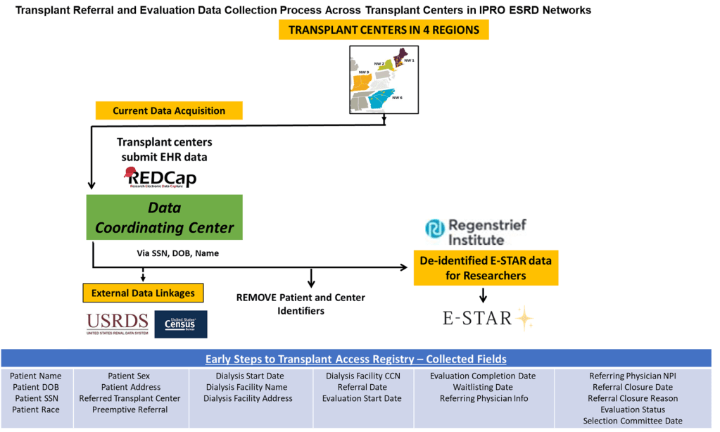 Step 7: The Regenstrief Institute links this merged patient- and transplant center- de-identified file via USRDS patient ID to a USRDS-supplied file of denominator (all incident ESRD patients) data. The final limited E-STAR dataset includes linked USRDS denominator data and select SRTR transplant center data.